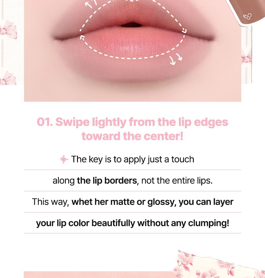 Apply a moderate amount starting from the lip line to the inner lips, then layer and blend for a natural finish.