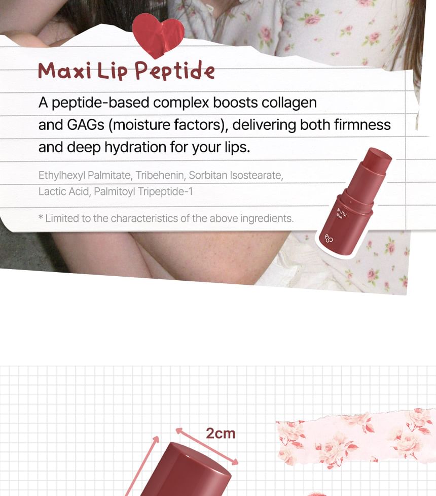 Formulated with a peptide complex including Ethylhexyl Palmitate and Palmitoyl Tripeptide-1 to lock in moisture and keep the lips soft throughout the day.
