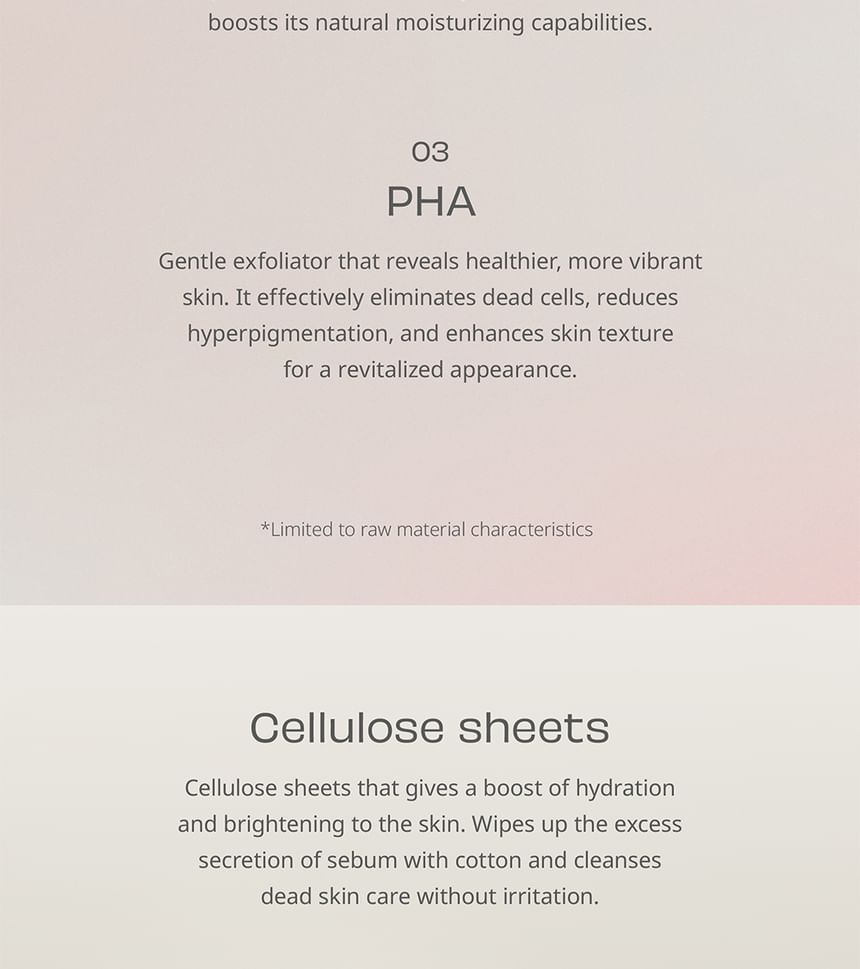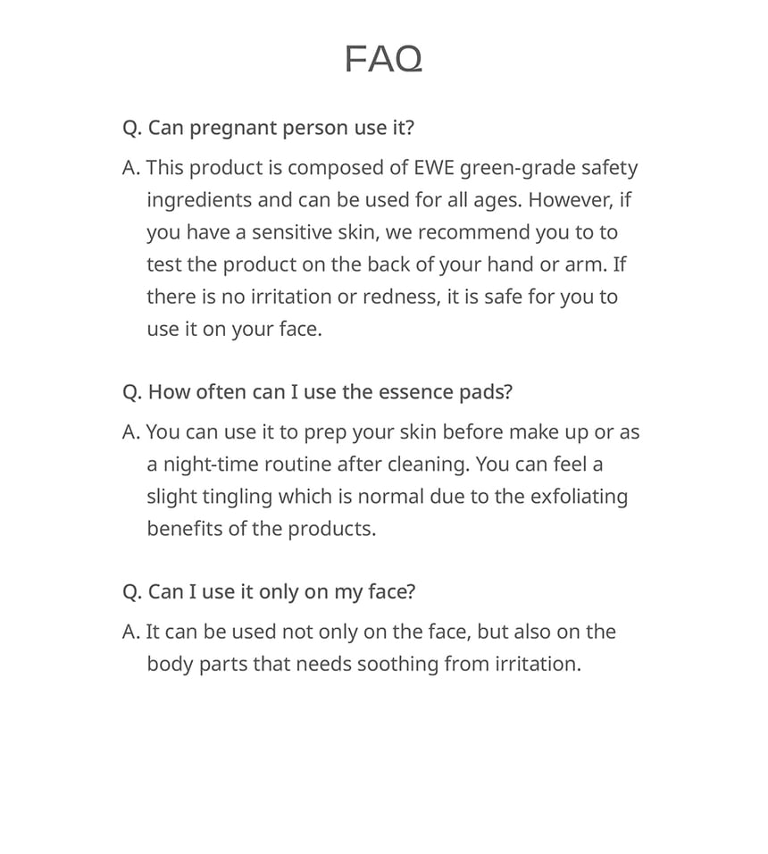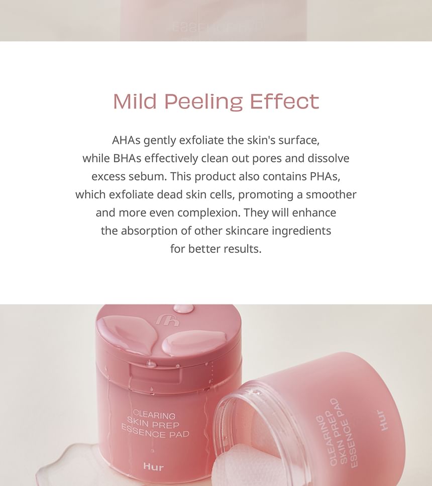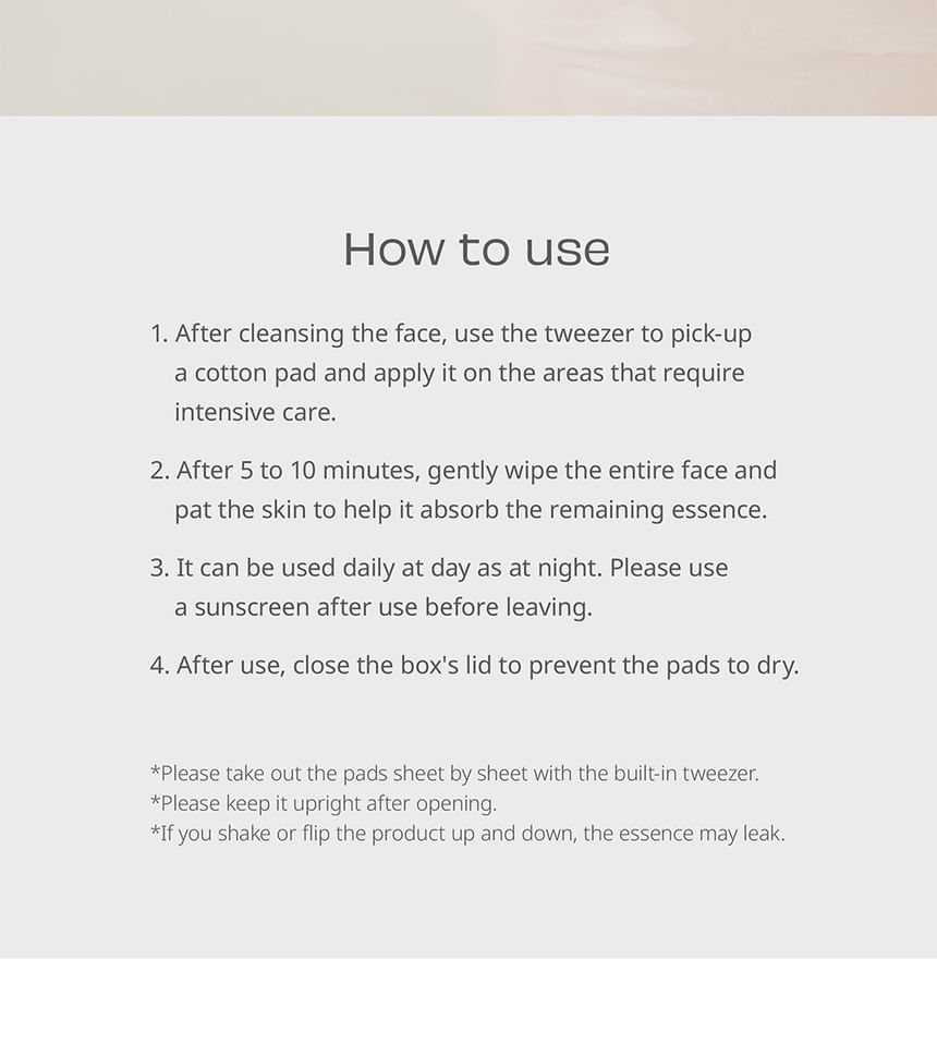 - A mild essence pad offers a gentle exfoliating effect while keeping your skin clear and refreshing.