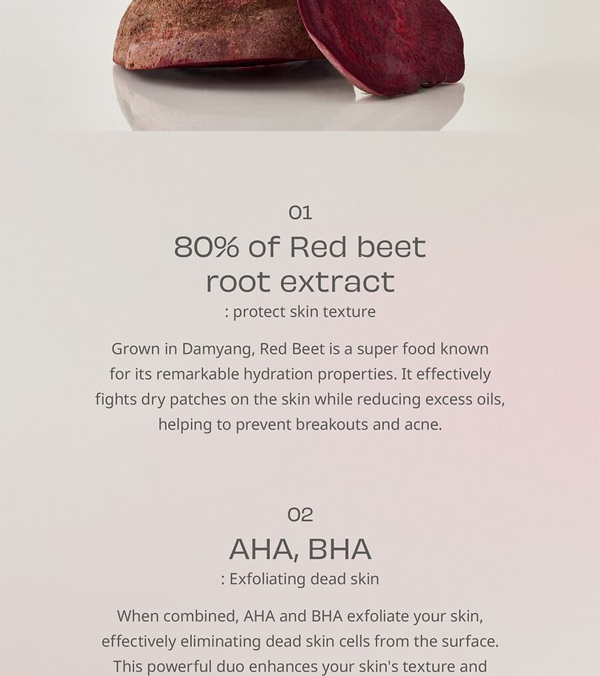 - Infused with 80% Red Beet Root Extract to provide rich moisture and nourishment to dry skin, helping to prevent breakouts and acne.