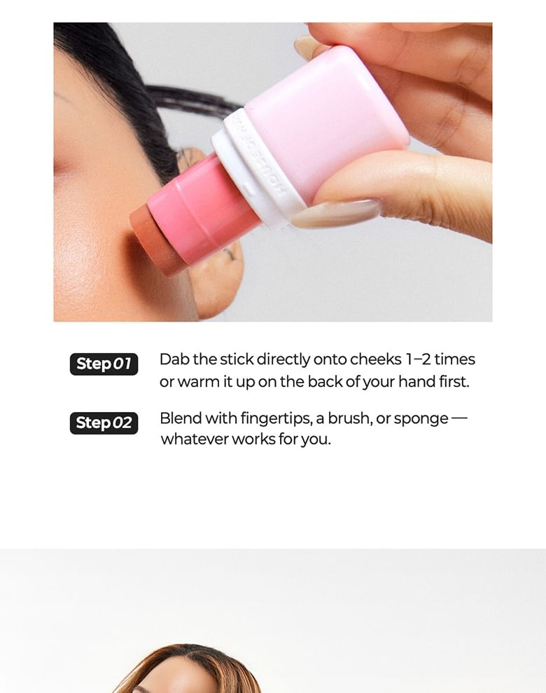 Dab the stick directly onto the cheeks and blend out evenly with fingertips, brush or sponge.