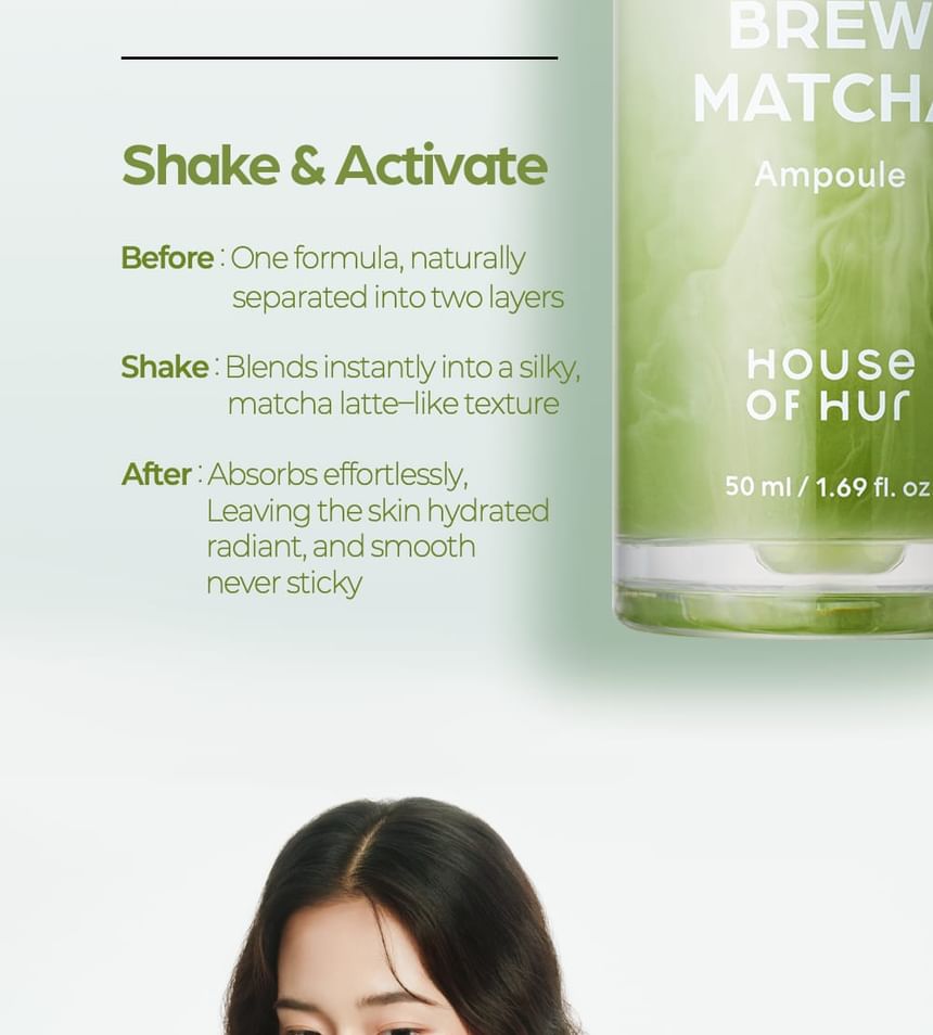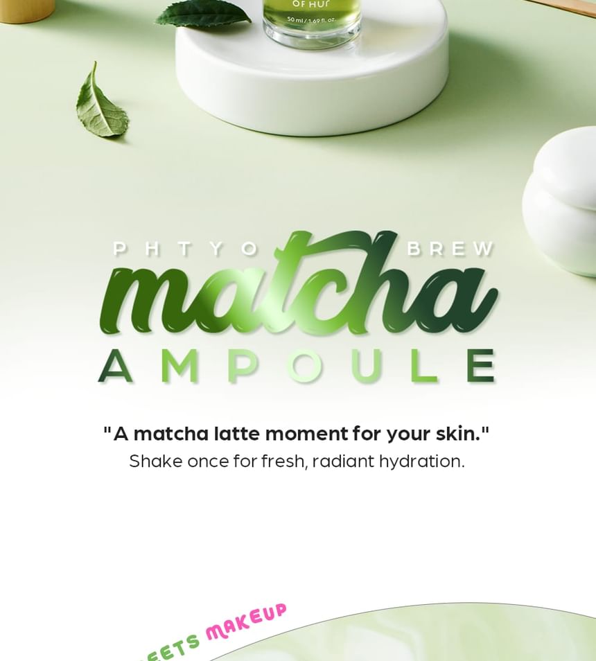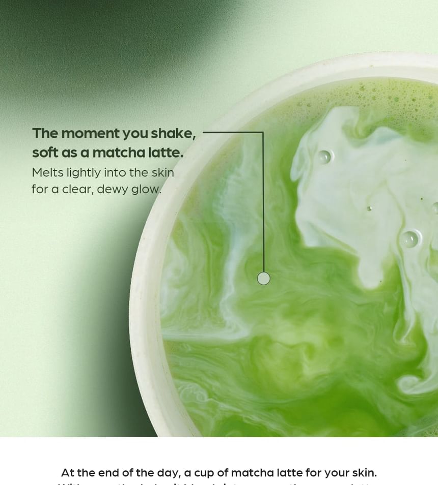 - A shaking-activated Matcha Latte Ampoule that nourishes and deeply moisturizes the skin.
