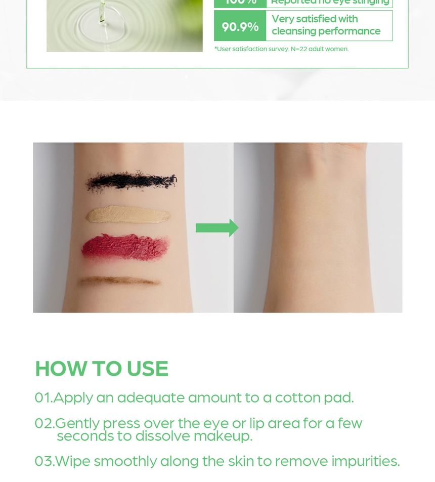 - 2. Gently press over the eye or lip area for a few seconds to dissolve makeup.