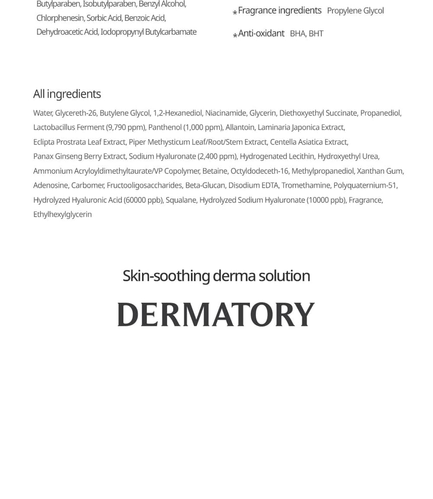 Water, Glycereth-26, Butylene Glycol, 1,2-Hexanediol, Niacinamide, Glycerin, Diethoxyethyl Succinate, Propanediol, Lactobacillus Ferment(9,790ppm), Panthenol(1,000ppm), Allantoin, Laminaria Japonica Extract, Eclipta Prostrata Leaf Extract, Piper Methysticum Leaf/Root/Stem Extract, Centella Asiatica Extract, Panax Ginseng Berry Extract, Sodium Hyaluronate(2,400ppm), Hydrogenated Lecithin, Hydroxyethyl Urea, Ammonium Acryloyldimethyltaurate/VP Copolymer, Betaine, Octyldodeceth-16, Methylpropanediol, Xanthan Gum, Adenosine, Carbomer, Fructooligosaccharides, Beta-Glucan, Disodium EDTA, Tromethamine, Polyquaternium-51, Hydrolyzed Hyaluronic Acid(60000ppb), Squalane, Hydrolyzed Sodium Hyaluronate(10000ppb), Fragance, Ethylhexylglycerin Ingredients subject to change at manufacturer's discretion. For the most complete and up-to-date list of ingredients, please refer to product packaging.